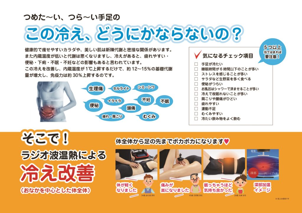 このラジオ波温熱療法と並行して、根本的な原因の姿勢の悪さやO脚を改善するために骨盤矯正も行います。正しい姿勢に矯正することにより冷え性が起こらなくなります。また正しい水分補給や、家でできる運動などの指導なども行い、冷え性に悩まない体づくりを行っていきます。
