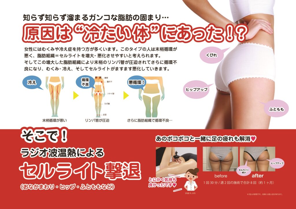 ラジオ波とは、電磁波の一種です。X線などとと違い、ラジオ波は全く体に害は無いのでご安心下さい。ラジオ波温熱療法は痛みを感じる部分やセルライトが気になる部分、脚、顔などに対して行う温熱療法です。細胞を直接温めることができるので痛めた筋肉や神経細胞を深部から温める事で早期修復を促します。骨盤矯正とセットで取り入れることにより、痛みや体の悩みを根元から改善します。