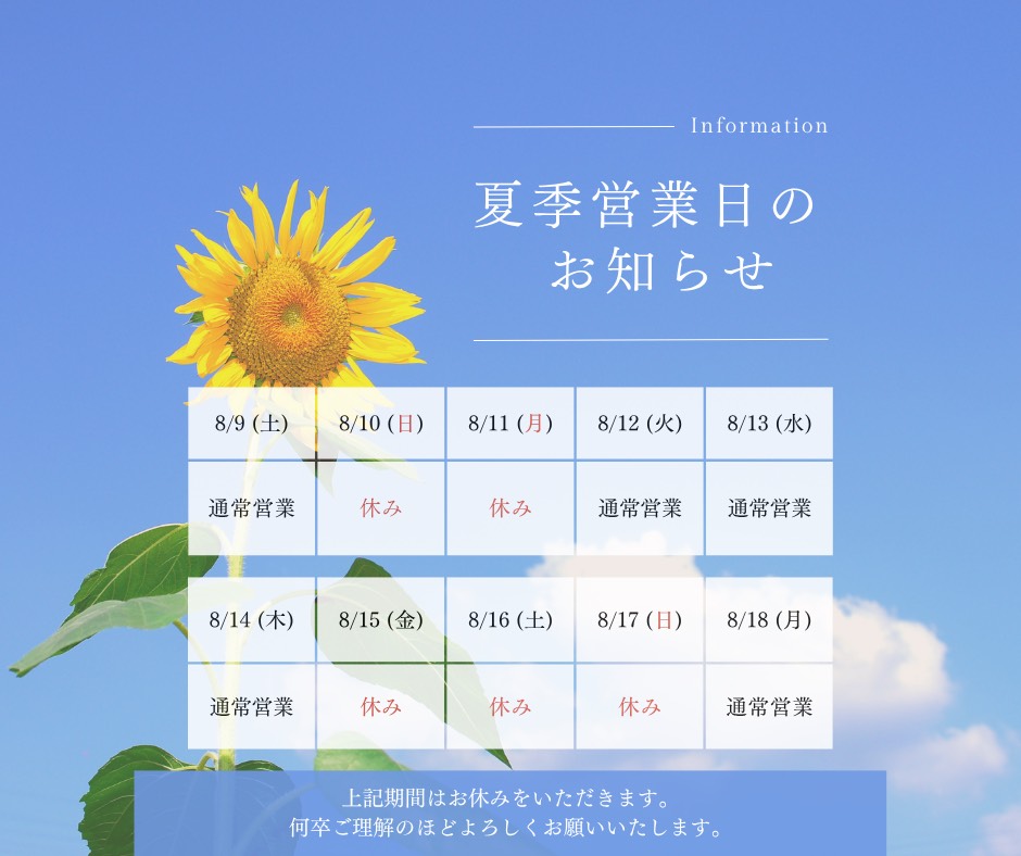 こんにちは(*^-^*) お盆休みのお知らせです♪ ご確認ください(^^)/ まだまだ暑い日が続きますが体調にはお気をつけください(^^)