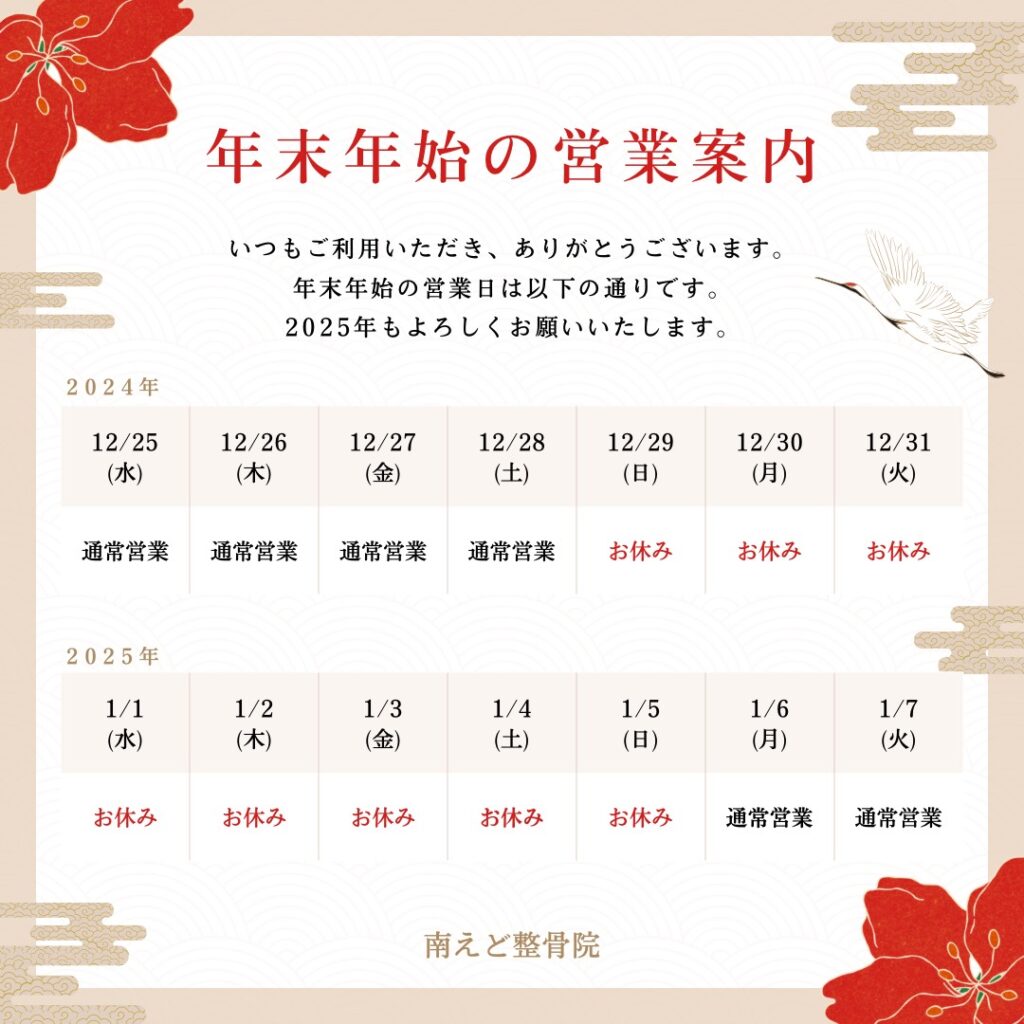 お知らせ 年末年始の営業日のお知らせ 2024.12.24 こんにちは(*^-^*) 年末年始の営業日のご案内です♪ ご確認お願いいたします(^.^) 1月6日(月)より元気に通常営業いたします☆彡 Post