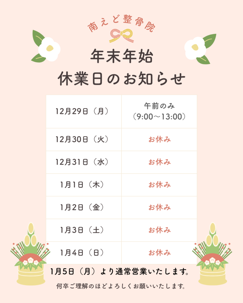 お知らせ 年末年始の診療日のお知らせ! 2025.12.15 こんにちは(^^)/ 南えど整骨院です♪ 年末年始のご案内です! R7 12/29(月)は午前のみ(09:00~13:00)の営業になります。 R8 1/5(月)より通常営業いたしますのでよろしくお願いいたします。 Post