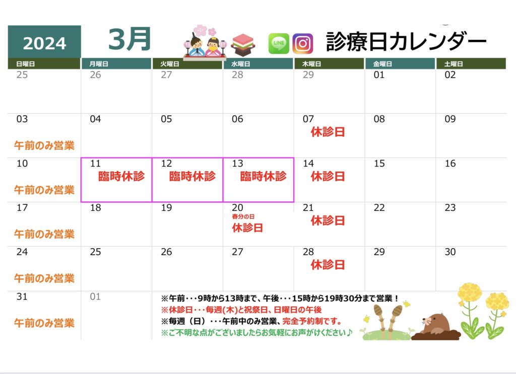 今月のお休み 3月の診療日のお知らせ 2024.03.02 こんにちは(^^)? 3月の診療日と休診日のご案内です? 今月は、11日(月)~13日(水)が院長先生が不在となる為、 お休みとさせて頂きます。 お間違えの無い様、またご迷惑をお掛け致しますが、よろしくお願い致します。 Post
