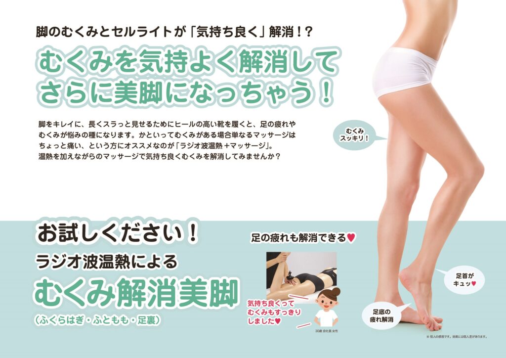 南えど整骨院では、むくみの治療には、まずラジオ波温熱療法を行います。専用の機械を使用して体の芯や、ふくらはぎ、太もも、足の裏、足先までを丁寧に治療していきます。