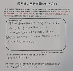 こちらの整骨院では、身体の不調部分を的確に把握してくれるのか、体の調子がいい間が長続きするようになってきました。